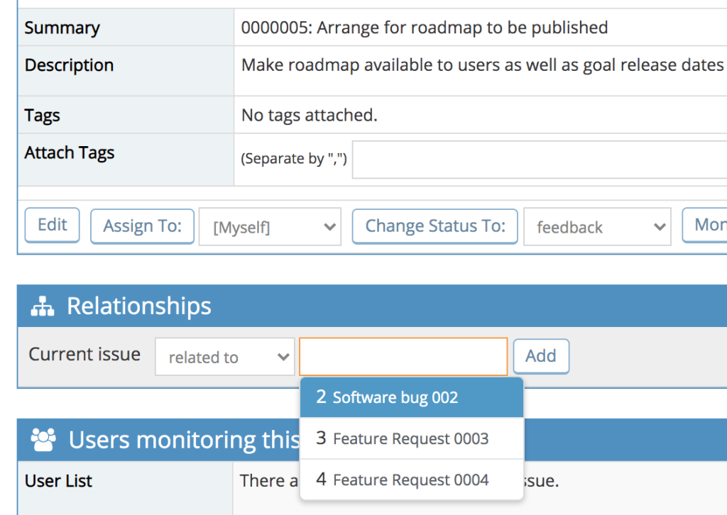 Auto-complete also helps out with issue IDs. When referencing an issue in MantisHub using the hashtag e.g. #549 this turns into a clickable link to take you to that issue, which is pretty handy. It’s a quick, easy way to reference another issue. But you would also probably be using the relationships section, under which you can define the type of relationship with another issue and it also gives you the status and summary of the issue without having to click the link.